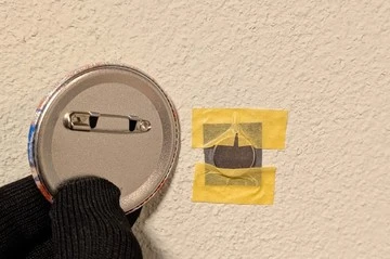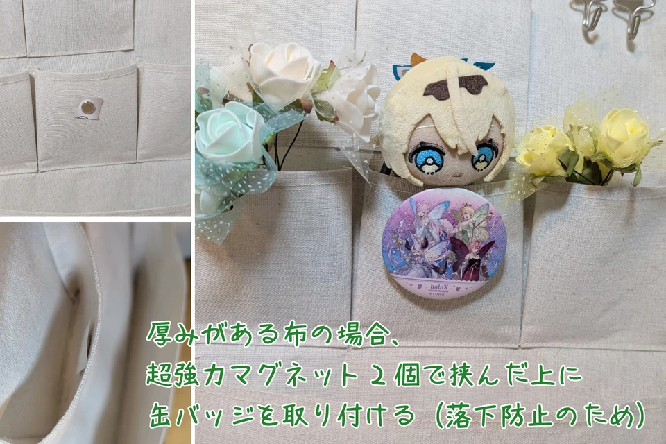 マグネットと缶バッジで布を挟むだけ