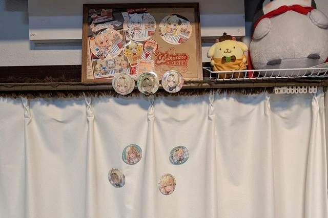 ちなみにカーテンを開閉しても缶バッジは落ちないよ。