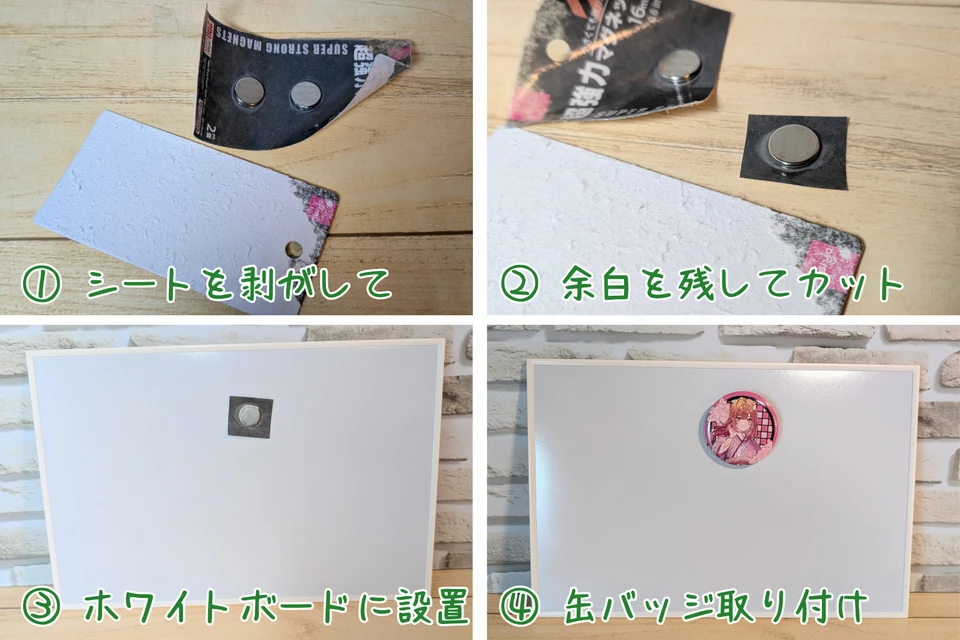 - 下地のボードを超強力マグネットネット2個で挟み、缶バッジを取り付ける